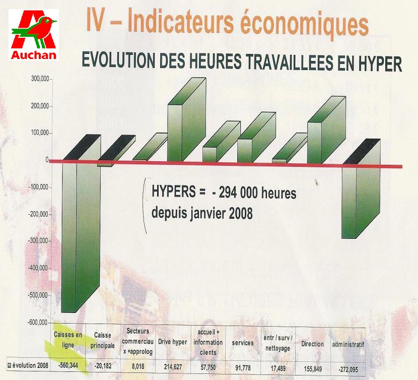 Manipulation par les chiffres. Auchan « oublie » d’indiquer le nombre de magasins supplémentaires sur cette période, ainsi que les agrandissements… Il y a bien eu une baisse importante des heures travaillées en caisse à Auchan, donc de l’emploi en moins. Et c’est parfaitement visible dans les documents d’Auchan >